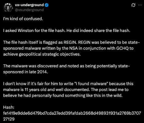 After Winston Ighodaro shared the malware, the story took another turn. vx-underground checked the hash and said it matched REGIN, a well-known piece of state malware linked to the NSA and the U.K.’s GCHQ. REGIN was first documented around 2014 and was believed to be used for long-term spying operations.
